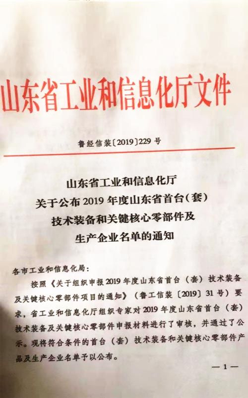 公司納入山東省首臺套生產(chǎn)企業(yè)名單